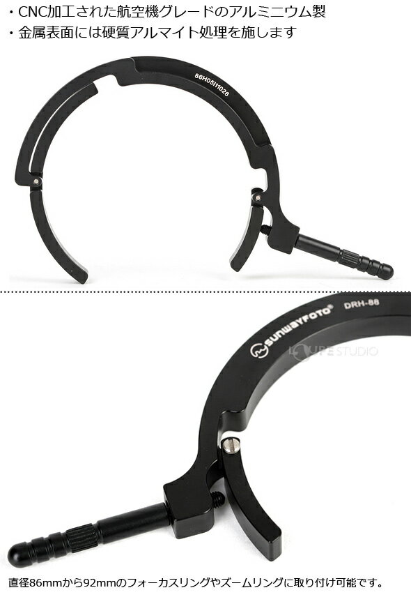 フォーカシング・ハンドル 86-92mm DRH-88 SF0103 SUNWAYFOTO サンウェイフォト アルカスイス対応スペック内径86mm-92mmハンドル長さ46mm質量65g SUNWAYFOTO SF0103※仕様及び外観は改善のため、予告なく変更することがあります。